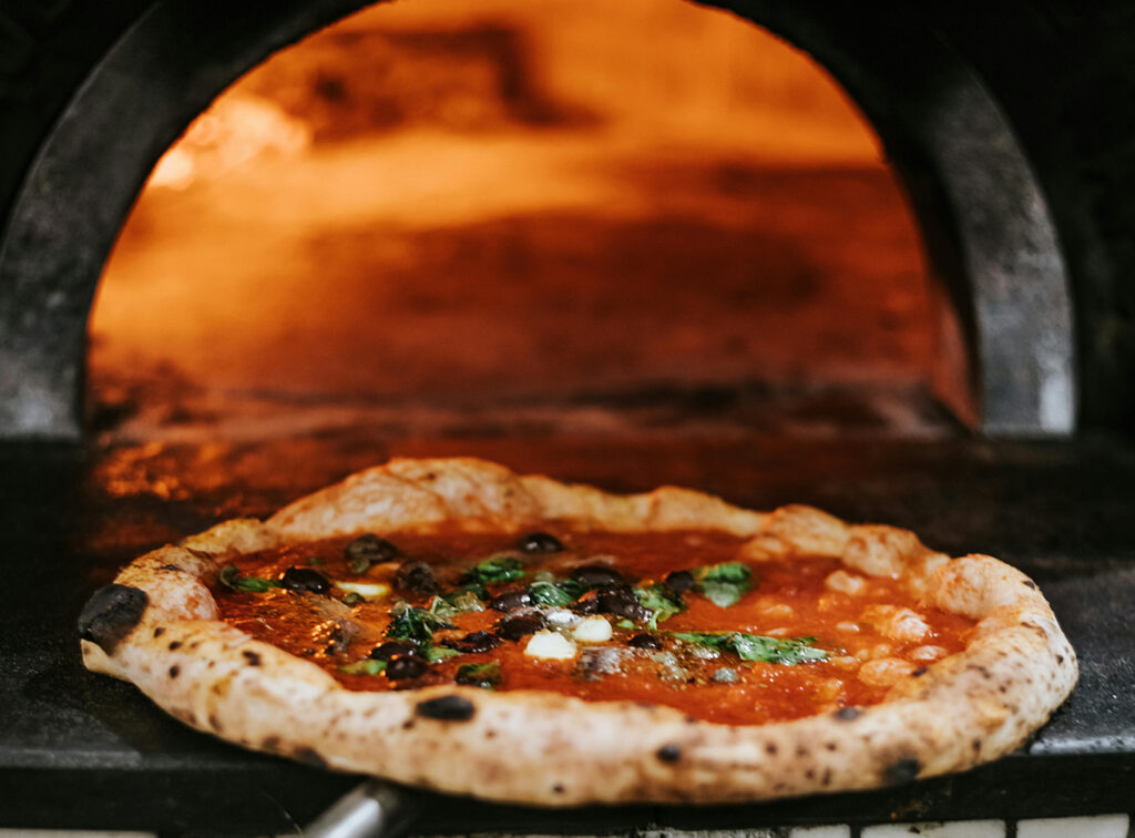 La madre de todas las pizzas. Su masa es esponjosa, con bordes inflados y un centro suave. Se cocina a altas temperaturas en horno de piedra, lo que le da ese sabor ahumado tan característico.